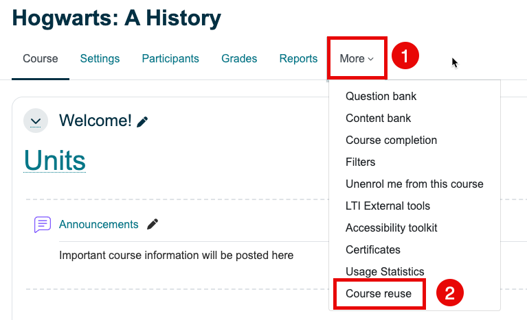 - Open the course you would like to import into. On the course main page, under the course title, click More. Then select Course reuse.