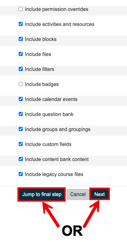 - You will be presented with the backup settings page with 2 options: 1-You can click Jump to final step if you want to import everything/all elements, OR 2-You can click Next and you will be taken to a page that presents a list of all the elements of the course you are importing. All of the elements will be selected by default, so deselect the elements you do not want to be imported over (see example below) and then click Next, again.