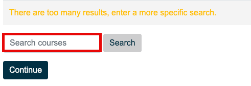 - If the course you wish to import does not show on the list, scroll down until you see the search text box. The search text box is located below the text “There are too many results, enter a more specific search”. Enter some text into the Search courses text box for example, the course acronym and number (ENGL1000) then click Search.
